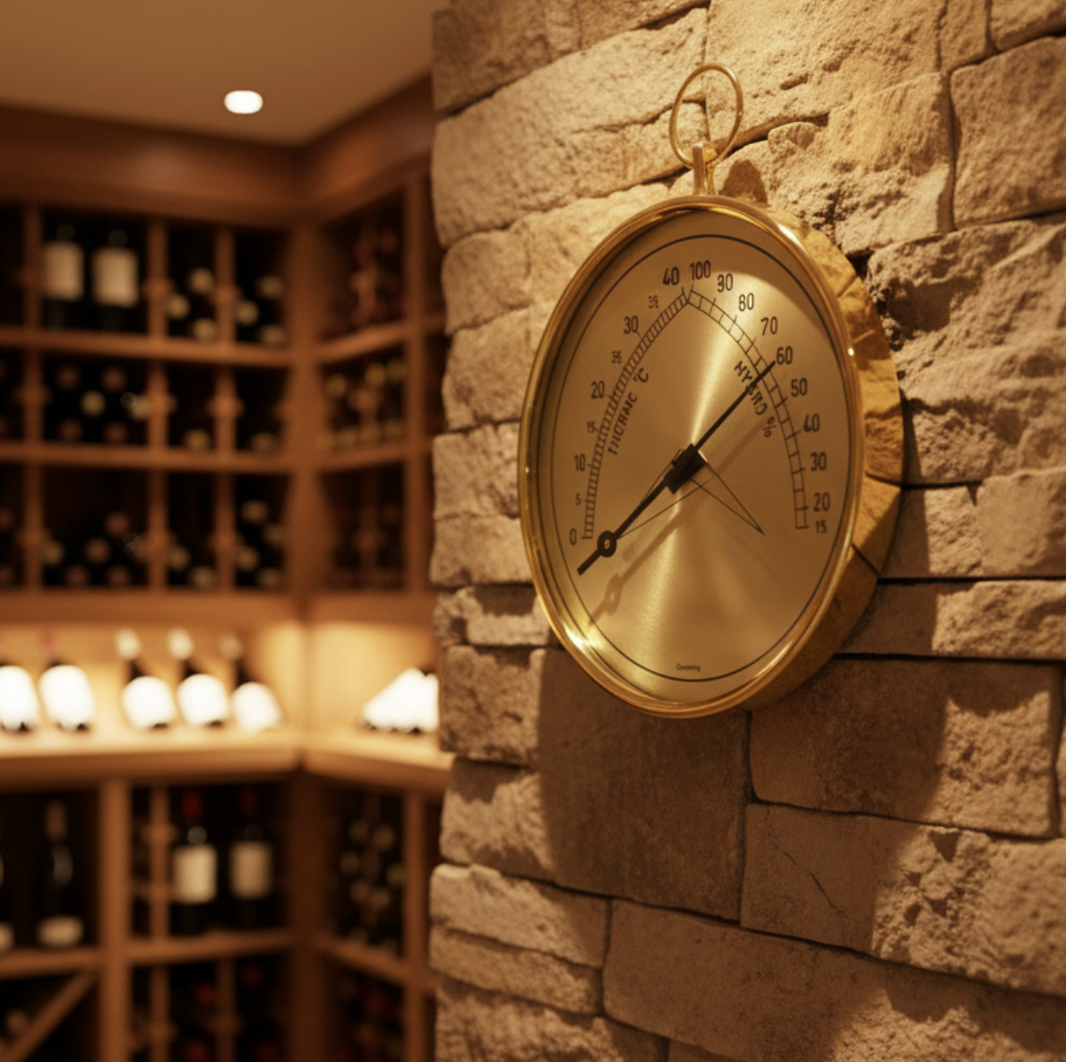 Klassisk analog hygrometer (luftfuktighet 15-100%) och termometer (0°-40°C) för kontroll av miljön i vinkällaren.