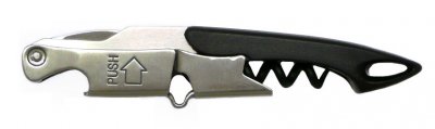 Utrustad med en patenterad dubbel och fjädrande hävarm. Rostfri räfflad och böjd kniv för effektivt avlägsnande av folie. Skruv i tunt teflonbelagt rostfritt stål som lätt smyger in i korken. Kapsylöppnare.