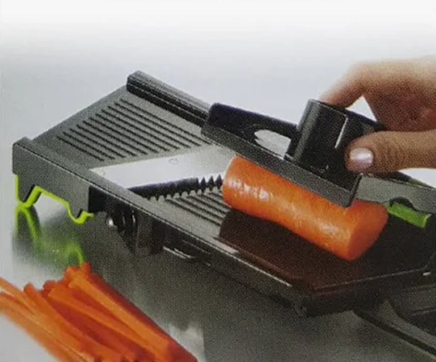 ”Jag klarar mig för det mest utan en hushållsassistent, däremot inte utan min mandolin. Smartaste köksverktyget för att skiva och strimla snabbt och enkelt. Nackdelen är att jag är lite rädd för att skära mig och de lösningar som funnits har inte funkat för mig. Den taggiga hållaren på räls på denna mandolin funkar perfekt för mig.Dessutom utan en massa lösa tillbehör att hålla reda på.”