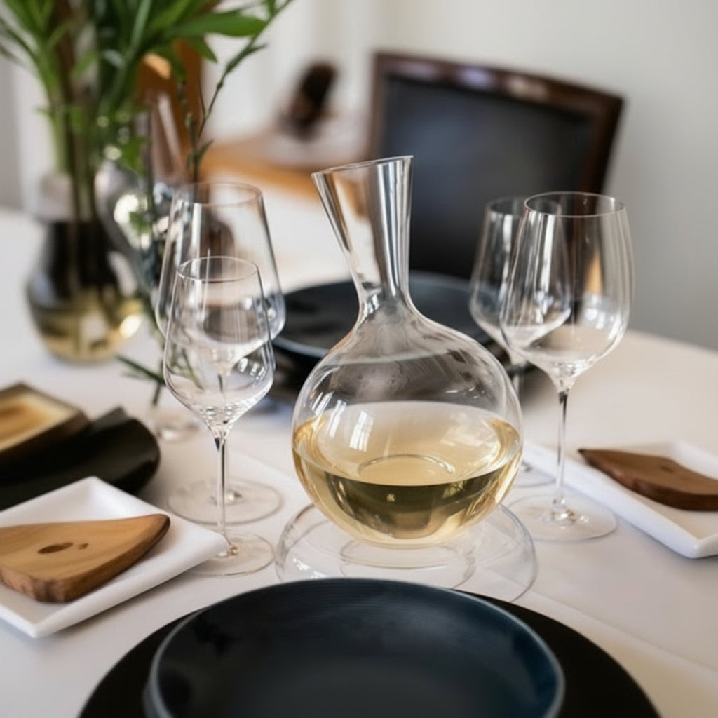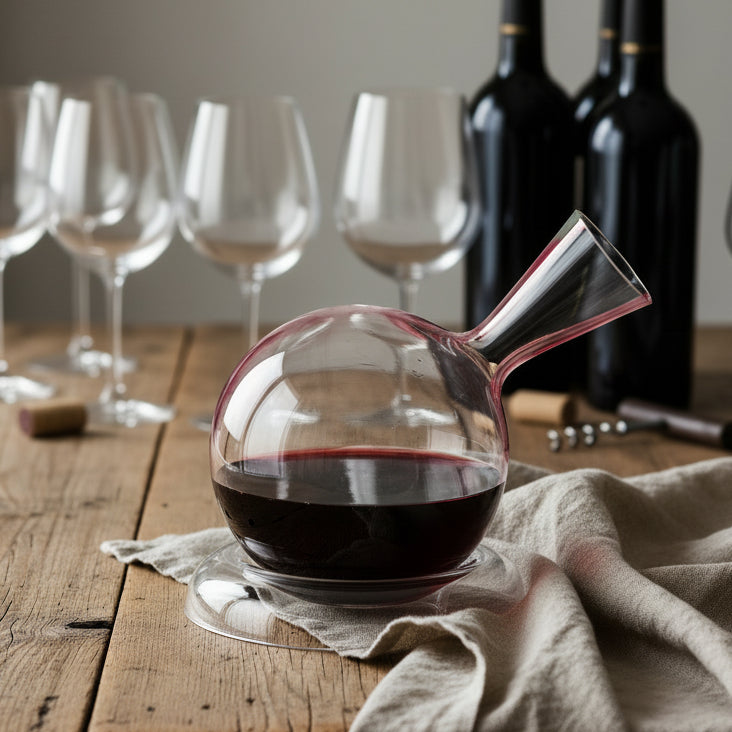 Munblåst blyfri kristallkaraff med helt rund botten. levereras med bas av glas där karaffen kan ställas i valfri vinkel. Perfekt för luftning av en helbutelj (75 cl).