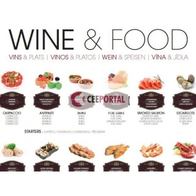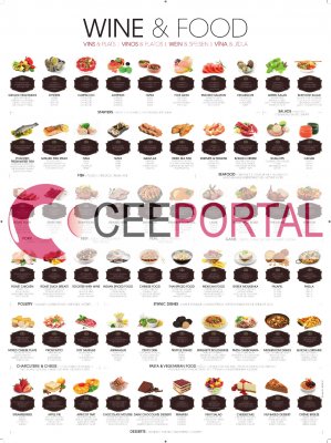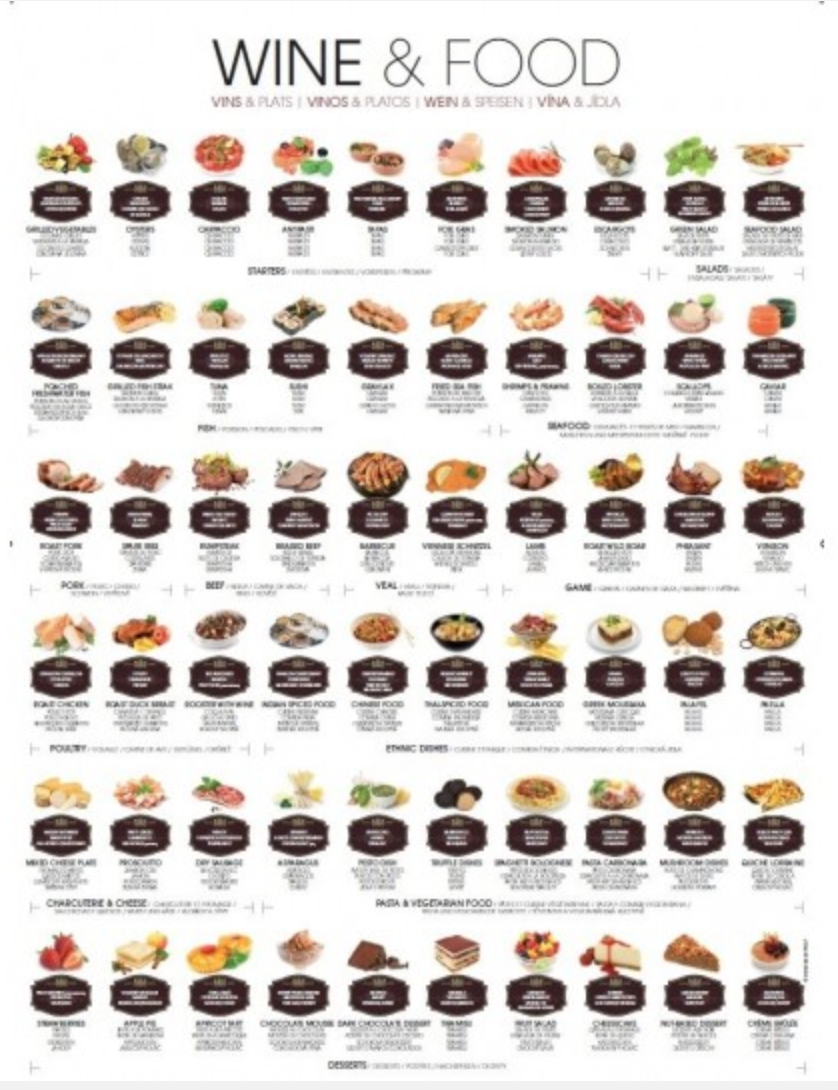 Elegant designad och detaljerad poster som illustrerar 60 olika maträtter och till vilka drycker de passar. Uppdelat i grupper om olika rätter och redovisar drycker efter druvor/appellationer/typer och på olika språk. Se detaljerad info nedan.