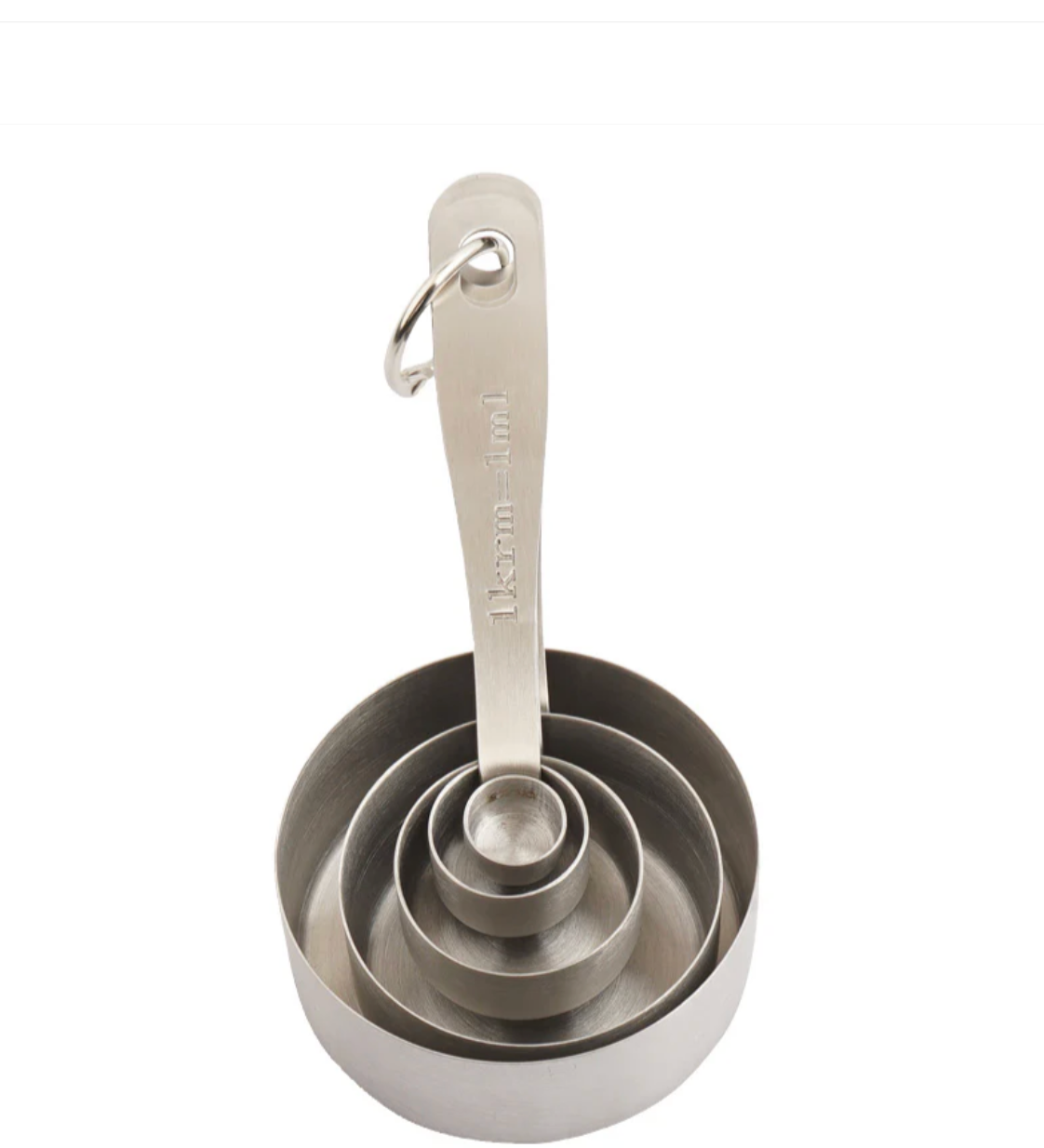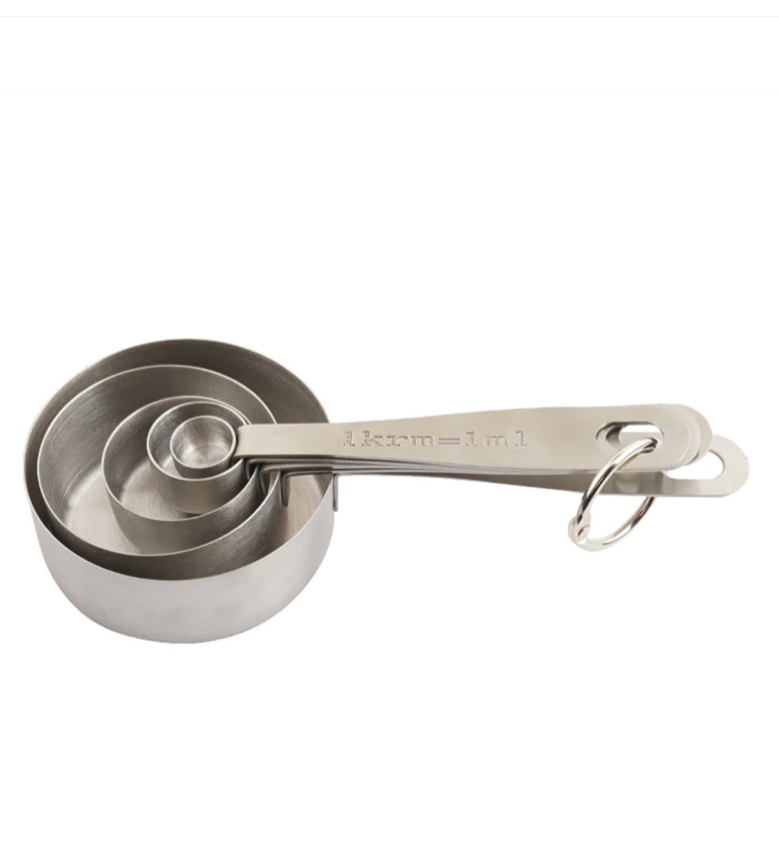 En måttsats i rostfritt stål med fem tydligt märkta mått – från kryddmått till deciliter. Perfekt för bakning och matlagning där exakt dosering gör skillnad. Diskmaskinsäker och byggd för dagligt bruk.