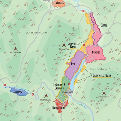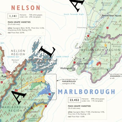 Den första detaljerad väggkartan över Nya Zeeland. Alla regioner och subregioner samt detaljkartor över Central Otago, Marlborough, Wairarapa, Hawke's Bay och Gisborne. Inkluderar också statistik över areal och viktigaste druvsorter för respektive region. Helt aktuell (tryckt 2020), mycket detaljerad, tydlig och grafiskt elegant och dekorativ karta.