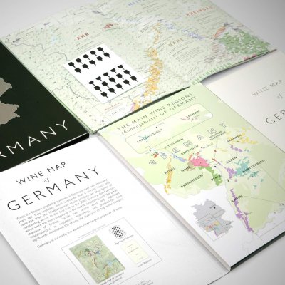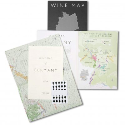 Inkluderar alla vinregioner (Anbaugebiete) uppdelade i sub-regioner (Bereich) samt alla de främsta vinnbyarna och druvsorter; detaljkartor över Rheingau och Mosel; angränsande regioner i Frankrike, Luxemburg och Schhweiz.